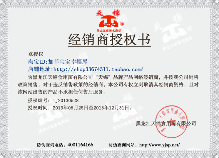 加菲宝宝幸福屋已经在2013年5月30日正式与天锦公司达成协议,并获得公司颁发的授权书,同时享受公司各项代理政策,并将店标与店铺链接放在官网首页予以推广。