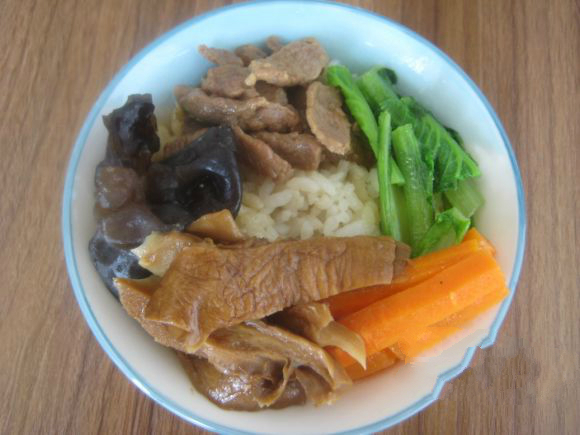 食材:主料米饭250g里脊肉150g元蘑100g木耳10朵。辅料:油、盐芝麻油、蚝油、酱油、葱、胡萝卜、小白菜。